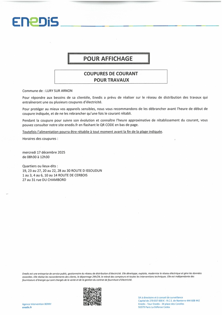 / COUPURE DE COURANT MERCREDI 17 DÉCEMBRE