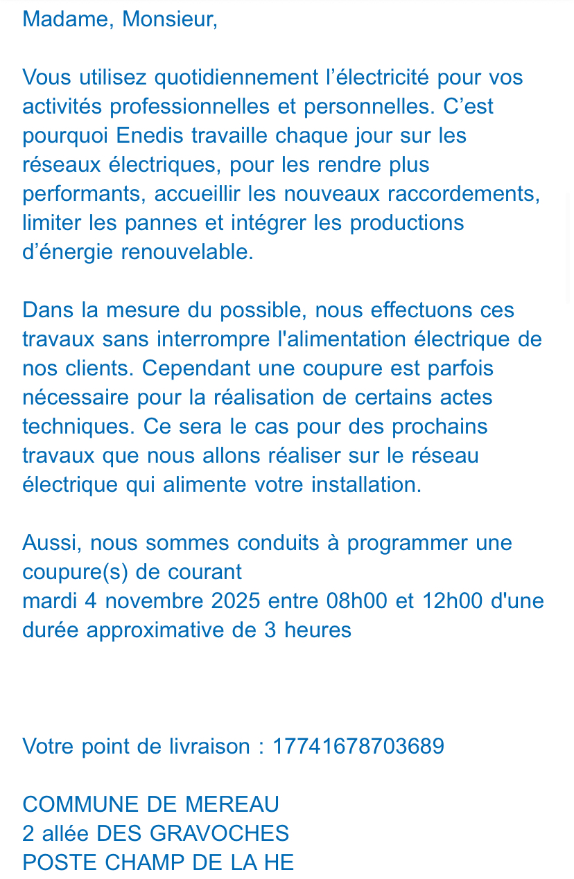 Coupure d’électricité le 04/11