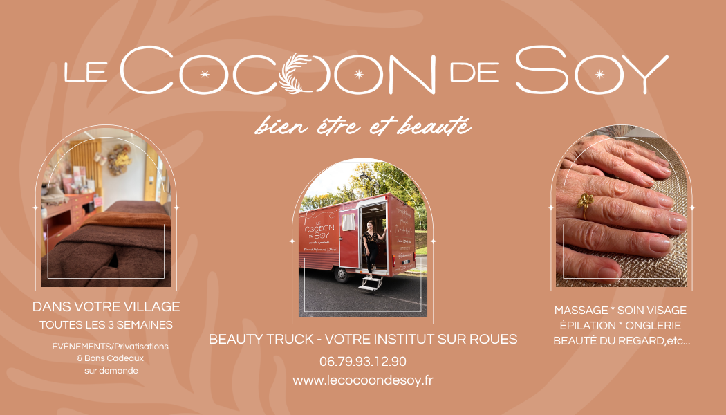 INFO BIEN ETRE 3/11/26 Le beauty truck Le Cocoon de Soy sera présent sur notre commune le mercredi 18 mars. Pensez à prendre rendez-vous!