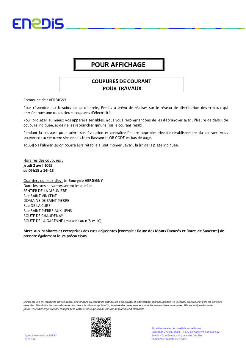 Coupure d'électricité 3/11/26 Attention: coupure d'électricité sur le secteur du Bourg le 2 avril 2026 Source : Mairie de Verdigny