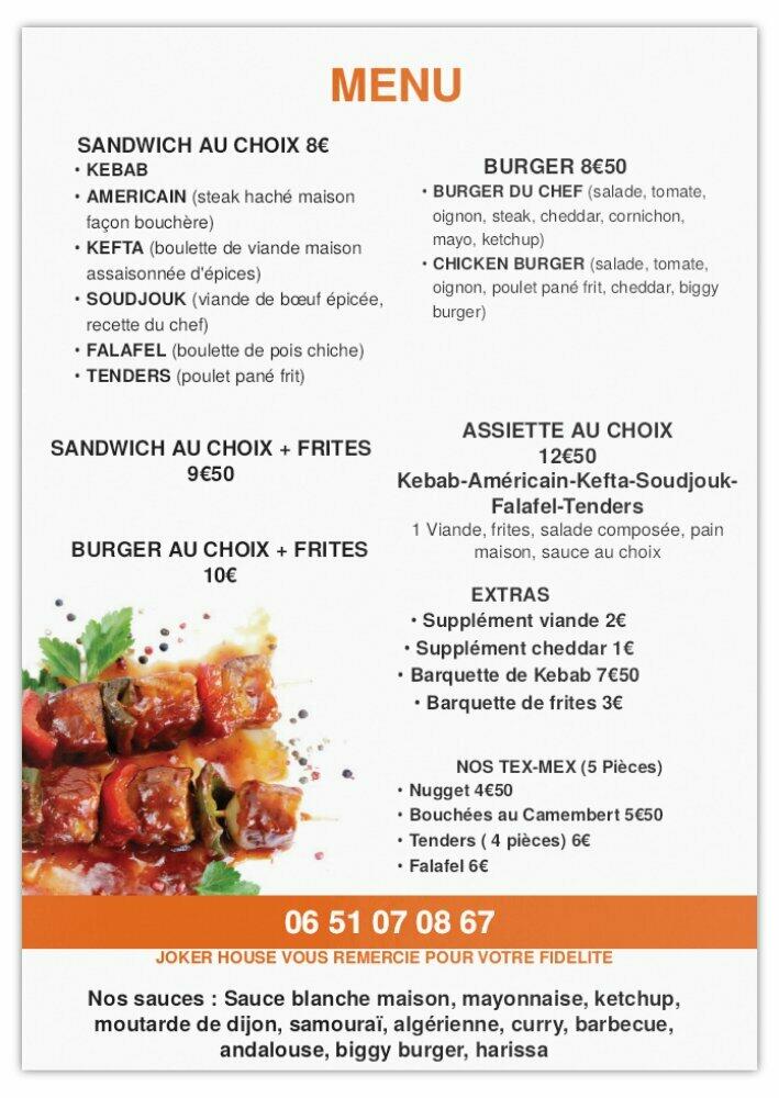 JOKER HOUSE, food truck proposant kébab, burger et friterie sera présent les mercredis de 18h à 21h sur la place du Monument aux Morts.