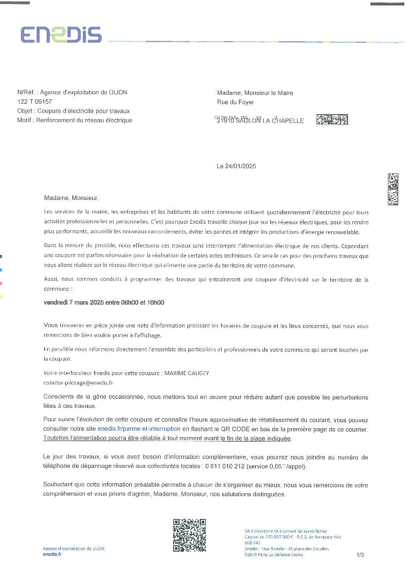 Afin d'améliorer la qualité de service, la société Enedis réalise des travaux qui nécessitent une coupure de courant.