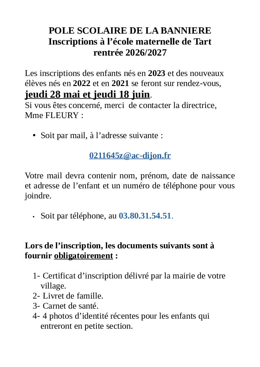 Inscriptions à l’école maternelle de Tart rentrée 2026/2027