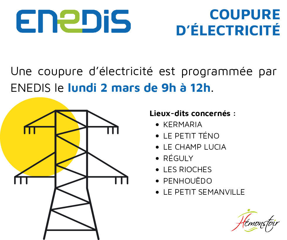 ENEDIS a informé la Mairie que des travaux sur le réseau électrique nécessitent une coupure de courant le lundi 2 mars de 9h à 12h.