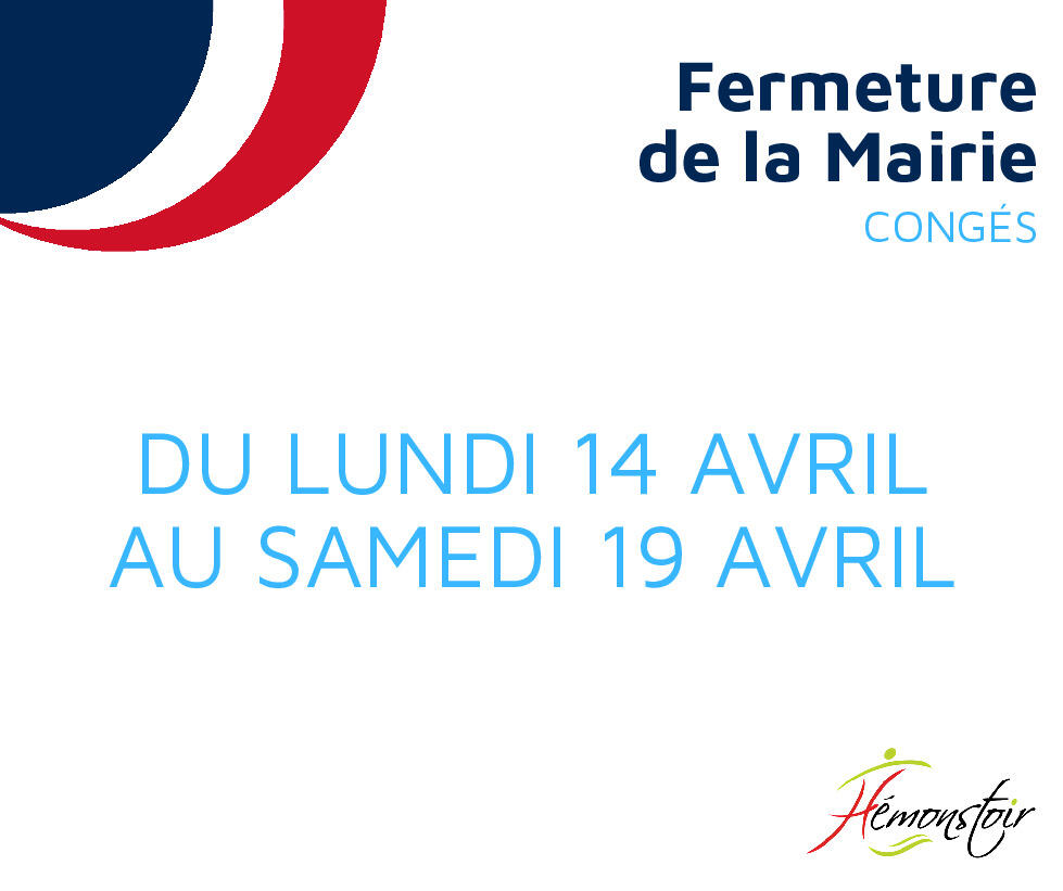 🔵 Fermeture de la Mairie - Congés 4/11/25 La Mairie sera fermée pour congés du lundi 14 au samedi 19 avril inclus.
