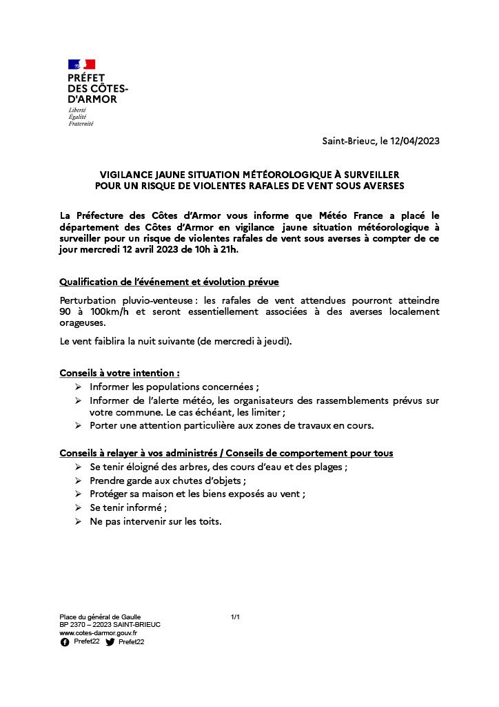 Vous trouverez ci-joint un message de la Préfecture des Côtes d’Armor informant que Météo France a placé le département en vigilance JAUNE Situation météorologique à surveiller pour un risque de violentes rafales de vent sous averses à compter de ce jour mercredi 12 avril 2023 de 10h à 21h.