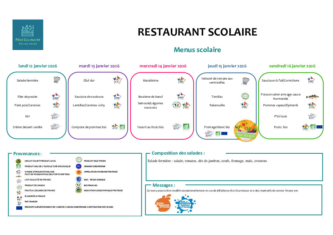 Menu du restaurant scolaire du 12 au 16 janvier2026 🍽️