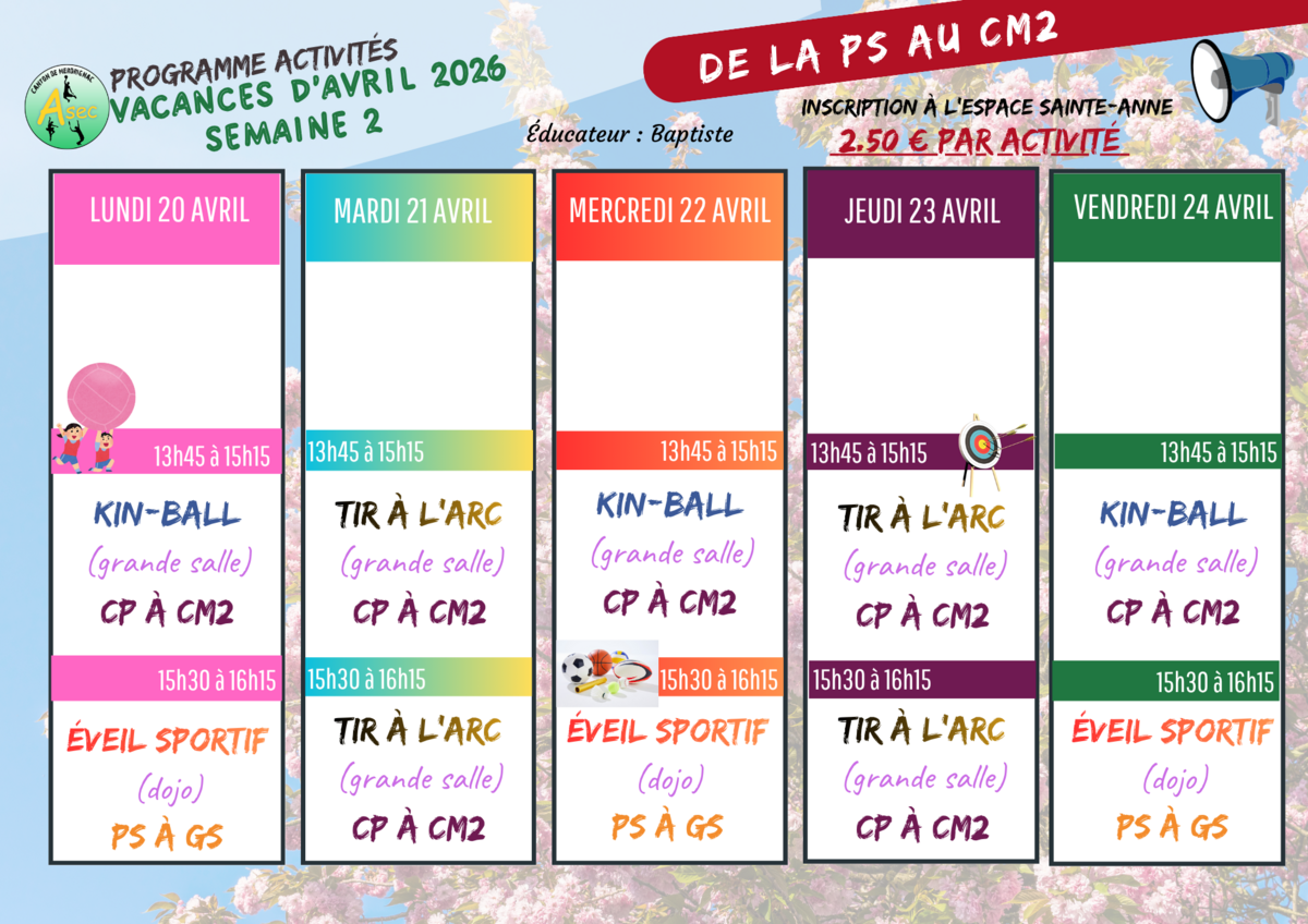 L'ASEC organise durant les vacances scolaires, du 13 au 24 avril 2026, un large choix d'activités sportives pour les enfants de la petite section au CM2.