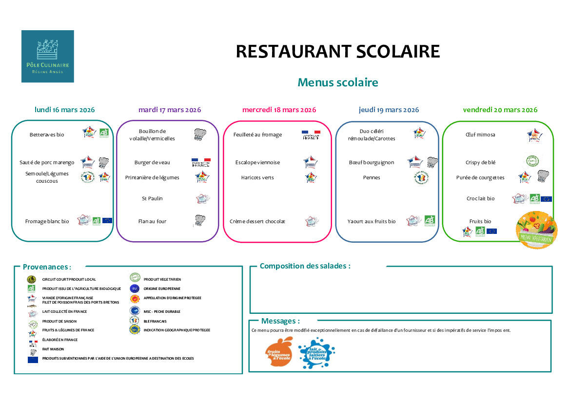 Menu du restaurant scolaire du 16 au 20 mars 2026 🍽️