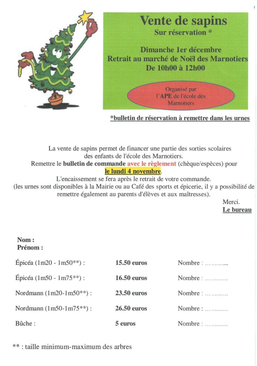 L'Association des Parents d’Élèves (APE) organise sa traditionnelle vente de sapins de Noël. Vous trouverez des bulletins de commande au café des sports et en mairie, bulletin à rapporter pour le lundi 4 novembre.