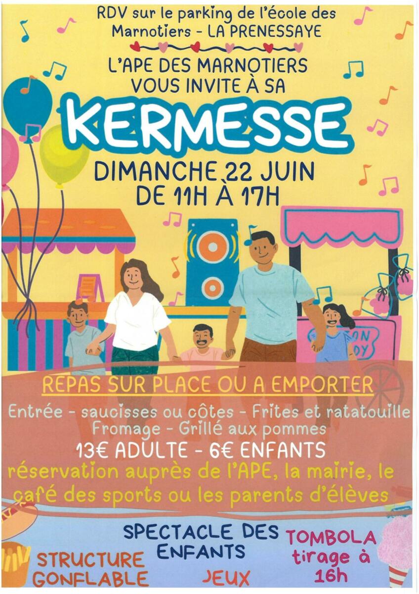 Dimanche 22  juin, l'Association  des Parents d’Élèves (APE) organise la traditionnelle kermesse sur le parking de l'école des Marnotiers.