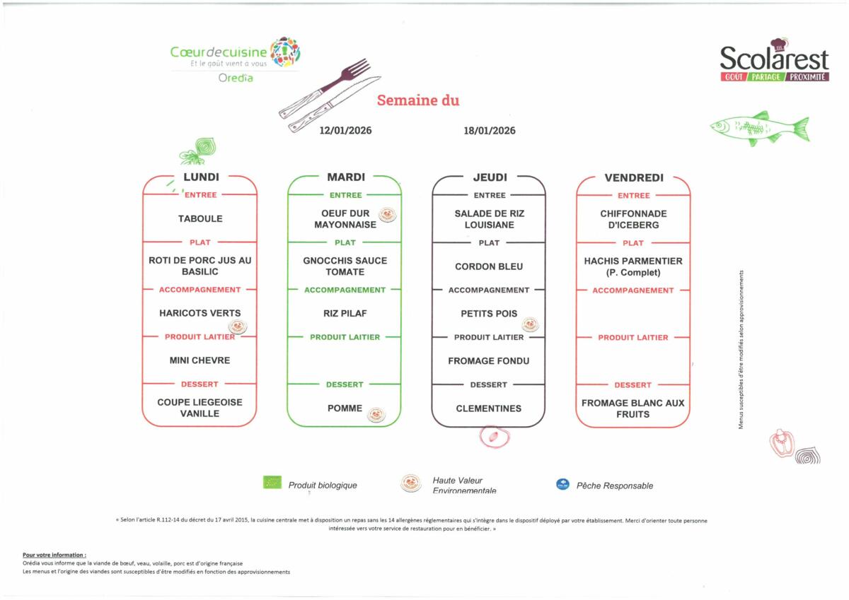 Veuillez trouver ci-dessous les menus du 12 au 16 janvier 2026