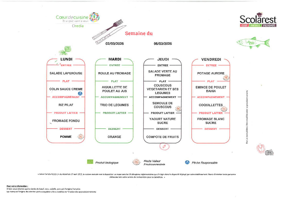Veuillez trouver ci-dessous les menus du 2 au 6 mars 2026
