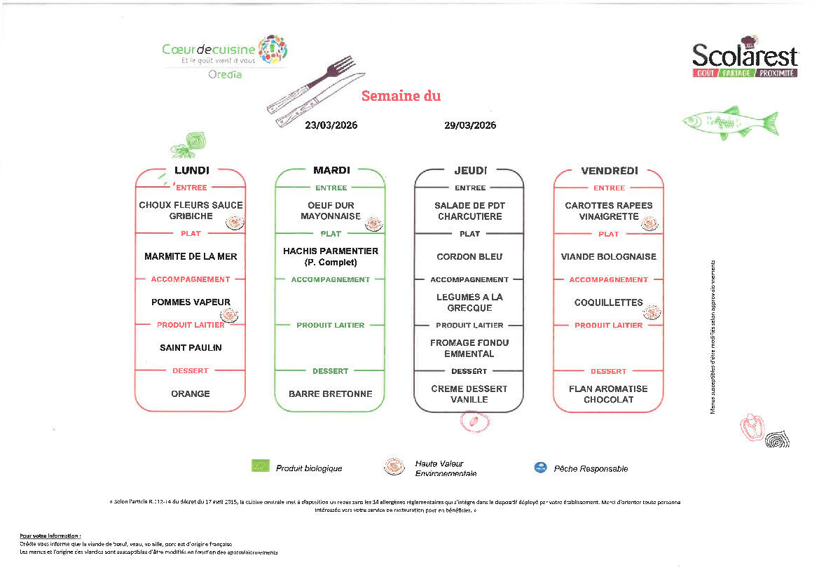 Veuillez trouver ci-dessous les menus du 23 au 27 mars 2026