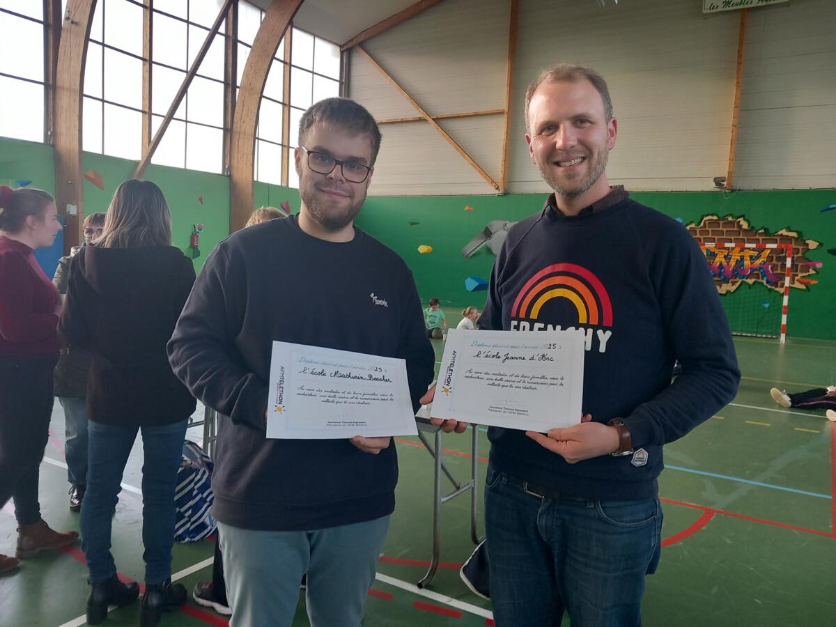 Les directeurs des écoles, Pierre pour l 'école Mathurin Boscher et Yann pour l'école Jeanne d Arc ont reçu un diplôme au nom du téléthon pour leur implication et leur dévouement à la cause..