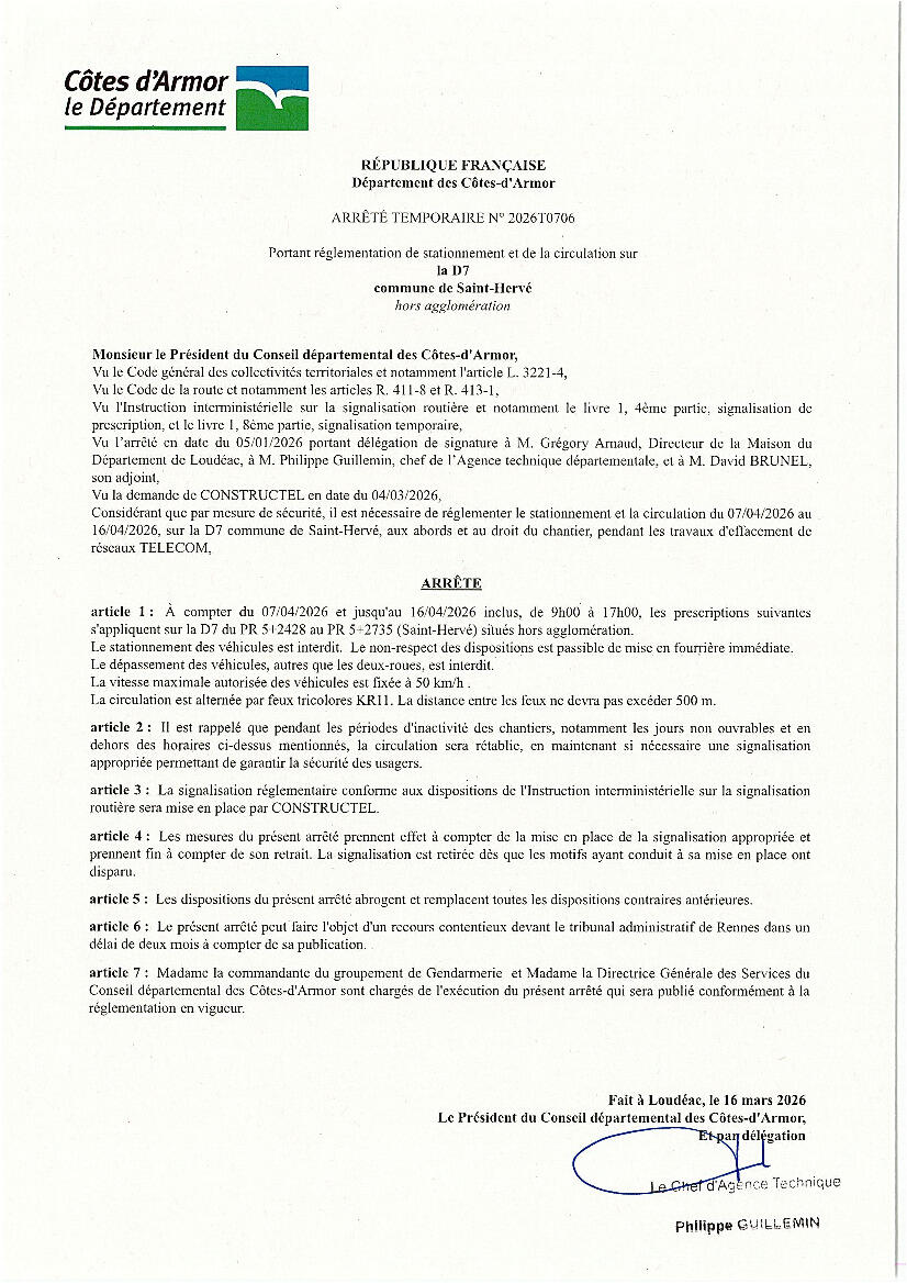 Veuillez trouver ci-joint l’arrêté n° 2026T0706 portant réglementation de la circulation (Circulation alternée et limitation de vitesse) sur la D7, du 7 avril 2026 au 16 avril 2026, commune de Saint-Hervé