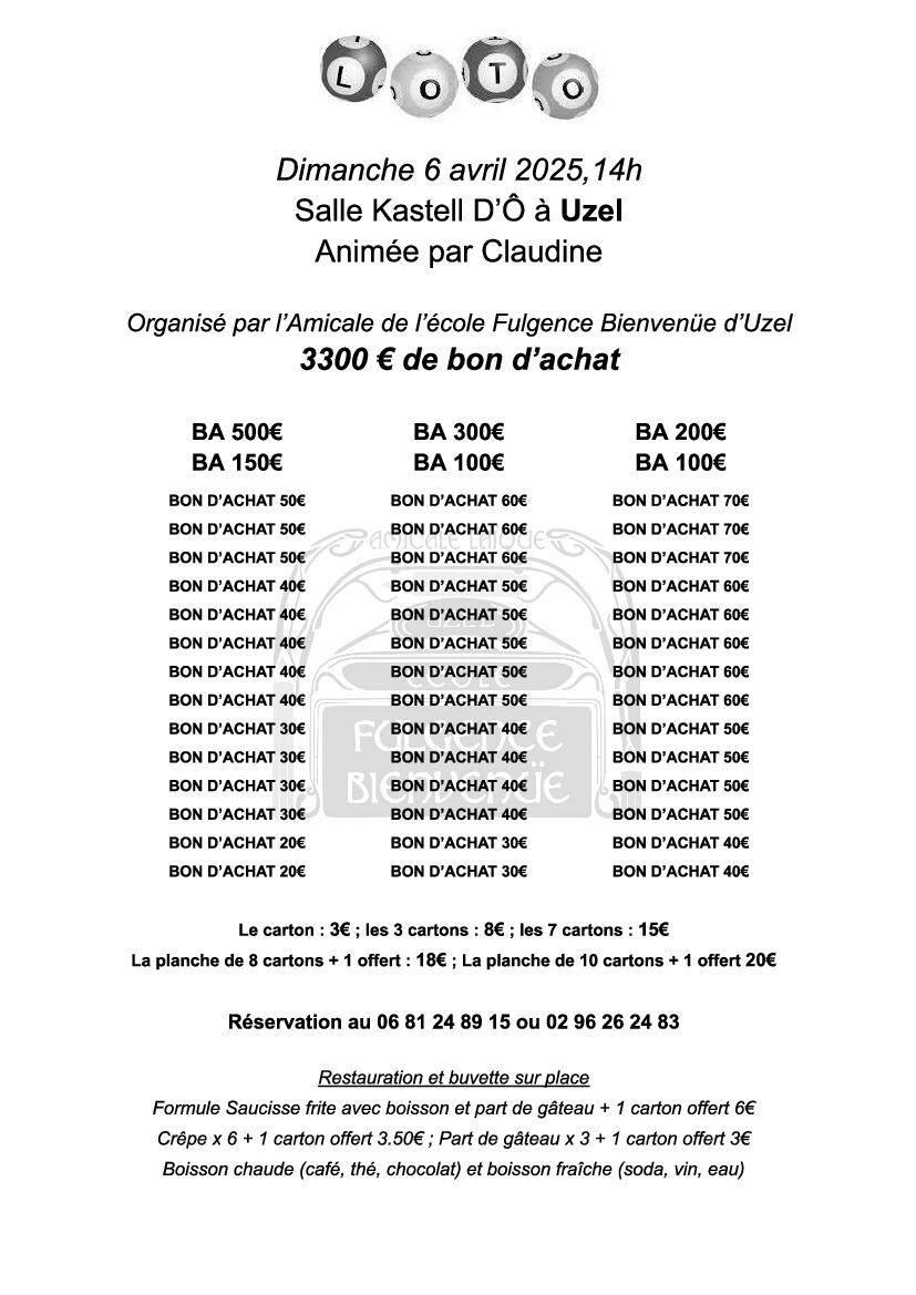 L'amicale Laïque de l'école Fulgence organise un LOTO à la salle KASTELL D'O le Dimanche 6 Avril 2025 à partir de 14h. Animée par Claudine.