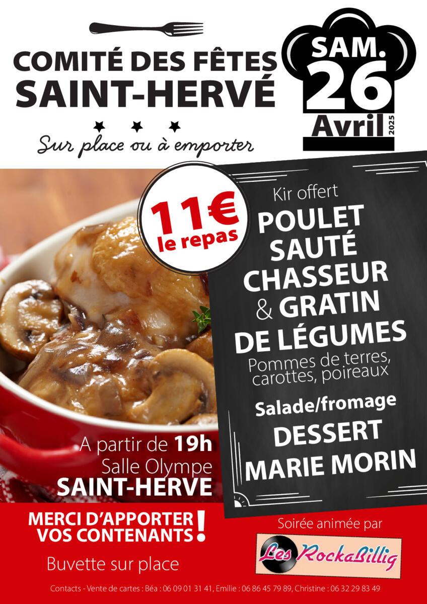 Le Comité des Fêtes de Saint Hervé est ravi de vous annoncer sa première grande animation de l'année ! Rendez-vous le samedi 26 avril à partir de 19h à la salle Olympe pour une soirée conviviale et pleine de surprises. Que vous soyez amateur de bonne cuisine ou passionné de musique, cette soirée est faite pour vous.