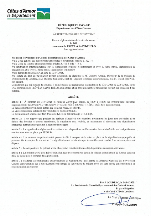/ Arrêté route D69 pour travaux : du 07 au 22 / 04