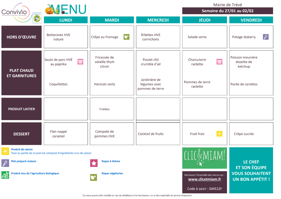 Menu Cantine Trévé : semaine du 27 au 31 janvier