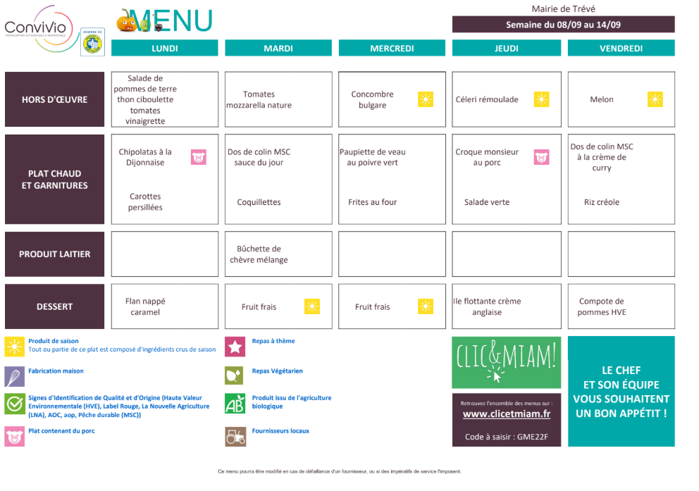 / Menu Cantine Trévé : semaine du 08 au 12 septembre