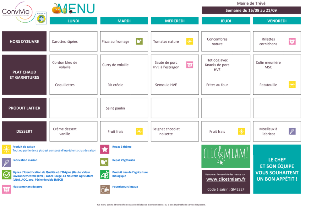 / Menu Cantine Trévé : semaine du 15 au 19 septembre