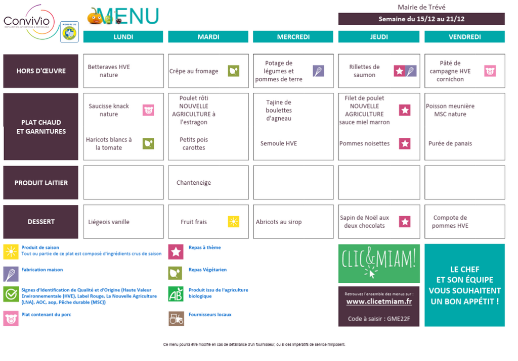 / Menu Cantine Trévé : semaine du 15 au 19 décembre