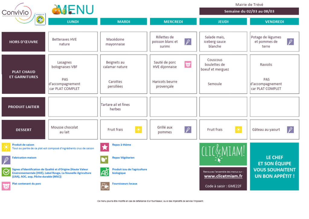 / Menu Cantine Trévé : semaine du 02 au 06 mars