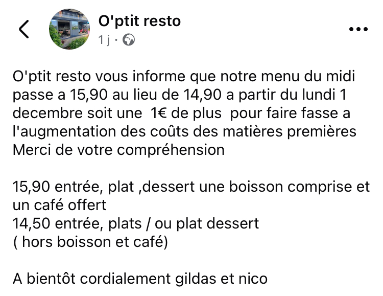 / O'ptit Resto : le menu passe de 14,90 € à 15,90