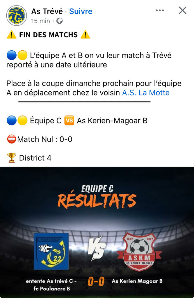 Trévé Sports: résultats du week-end 11/24/25 Et victoire des U10 contre le LOSC sur le synthétique de LOUDEAC. 5-0 4 buts de Lucas Laubé 1 but de Noa Le Bouffos Bravo à eux et aux coatchs Source : Mairie de Trévé
