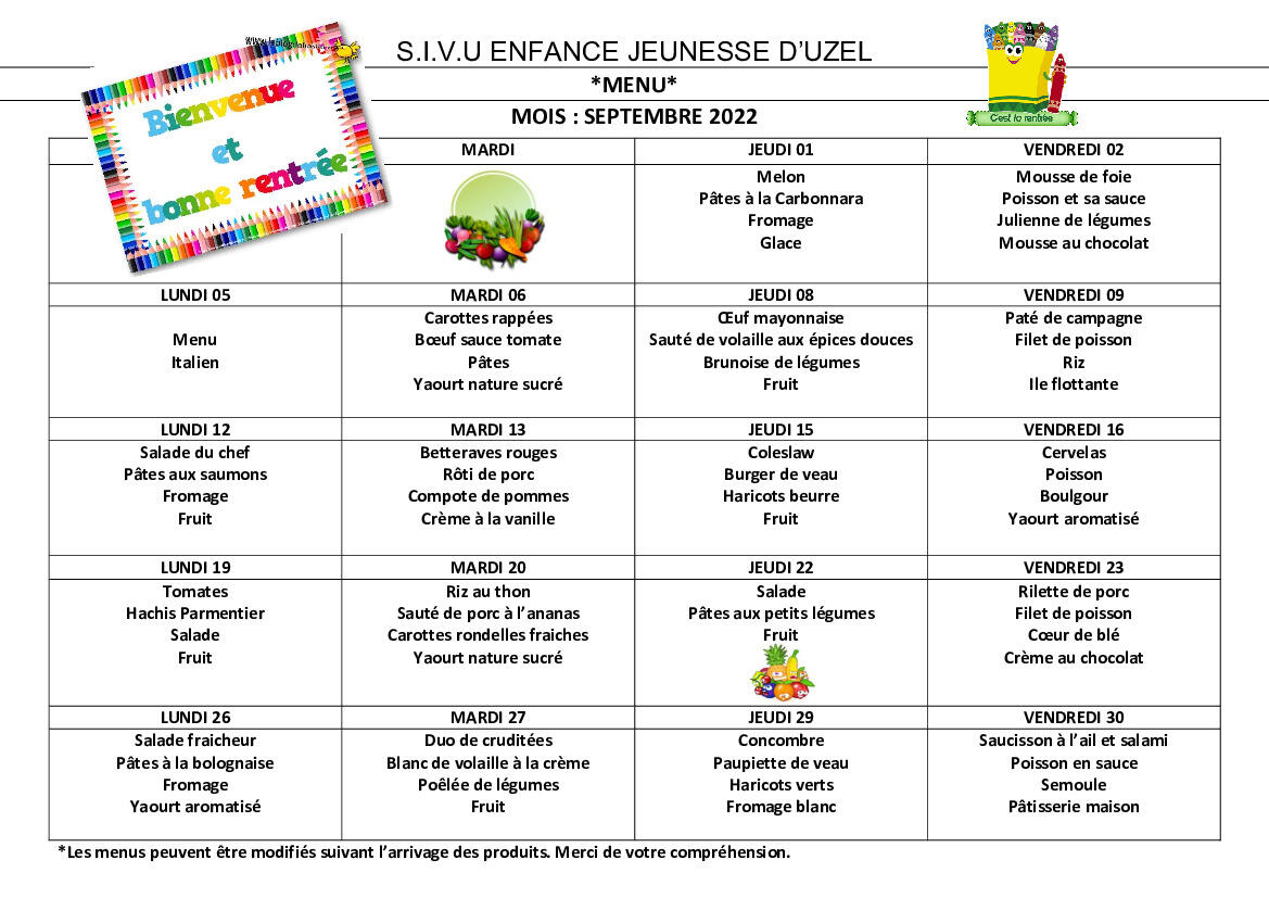 Cantine scolaire - Menus pour le mois de septembre 8/22/22 Voici les menus de la cantine pour le mois de septembre.