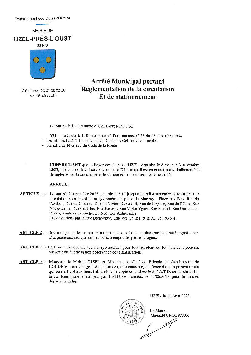 Les deux arrêtés de circulation en pièces jointes précisent les rues impactėes à l’occasion de l’organisation de la course des caisses à savon du dimanche 03 septembre.