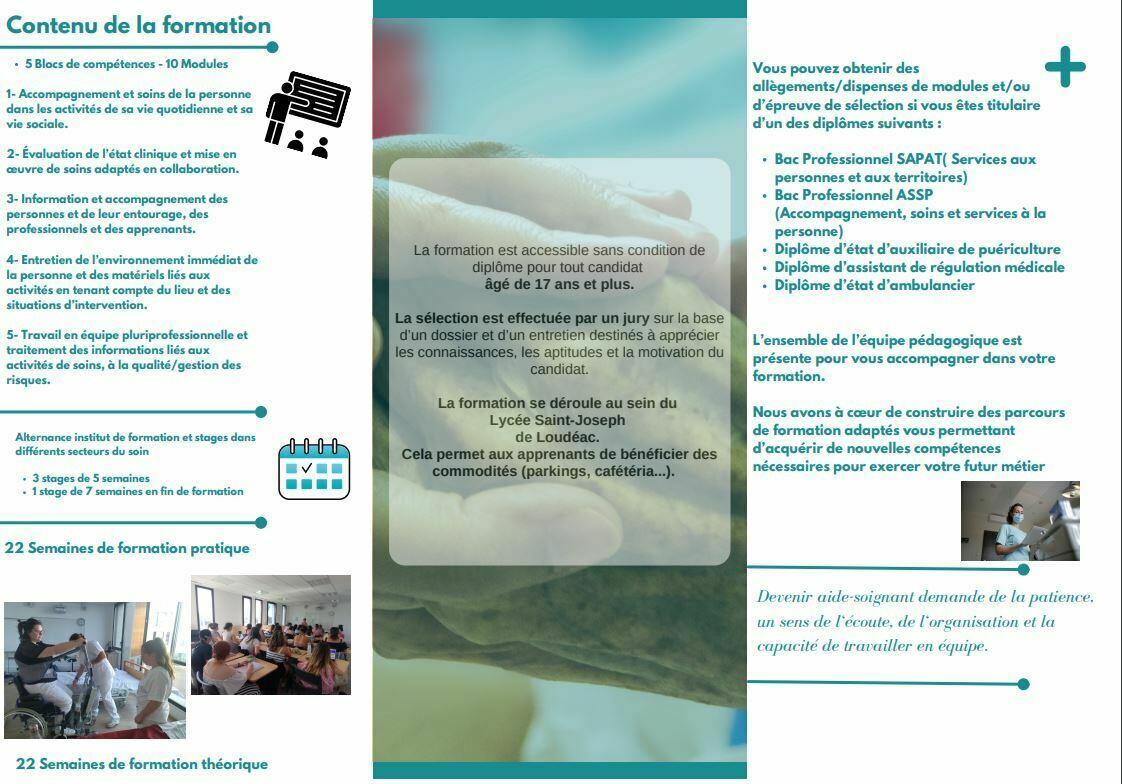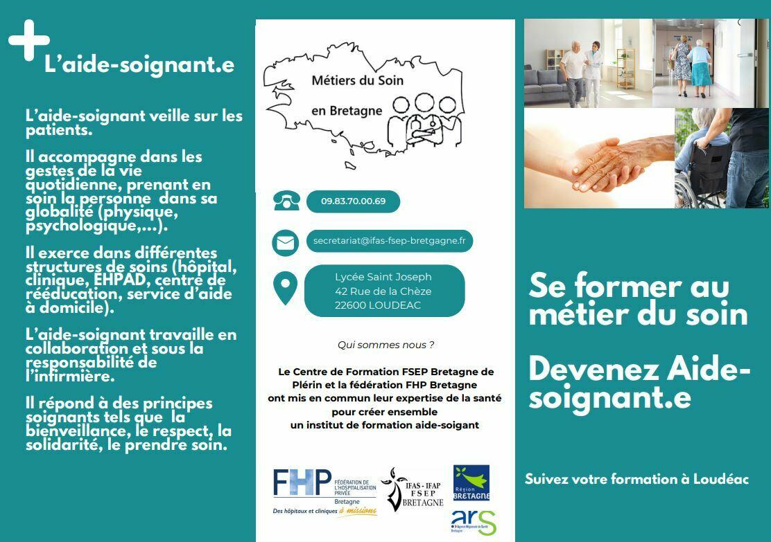 La formation d’Aide-Soignant débutera le lundi 22 janvier sur le site du Lycée Saint Joseph de Loudéac, 42 rue de la Chèze.