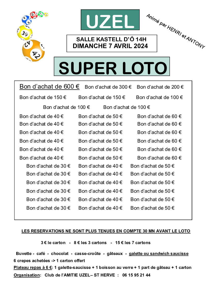 Loto du Club de l'Amitié Uzel-St Hervé le Dimanche 7 Avril 3/19/24 A partir de 14H, salle Kastell d'O. Venez nombreux.