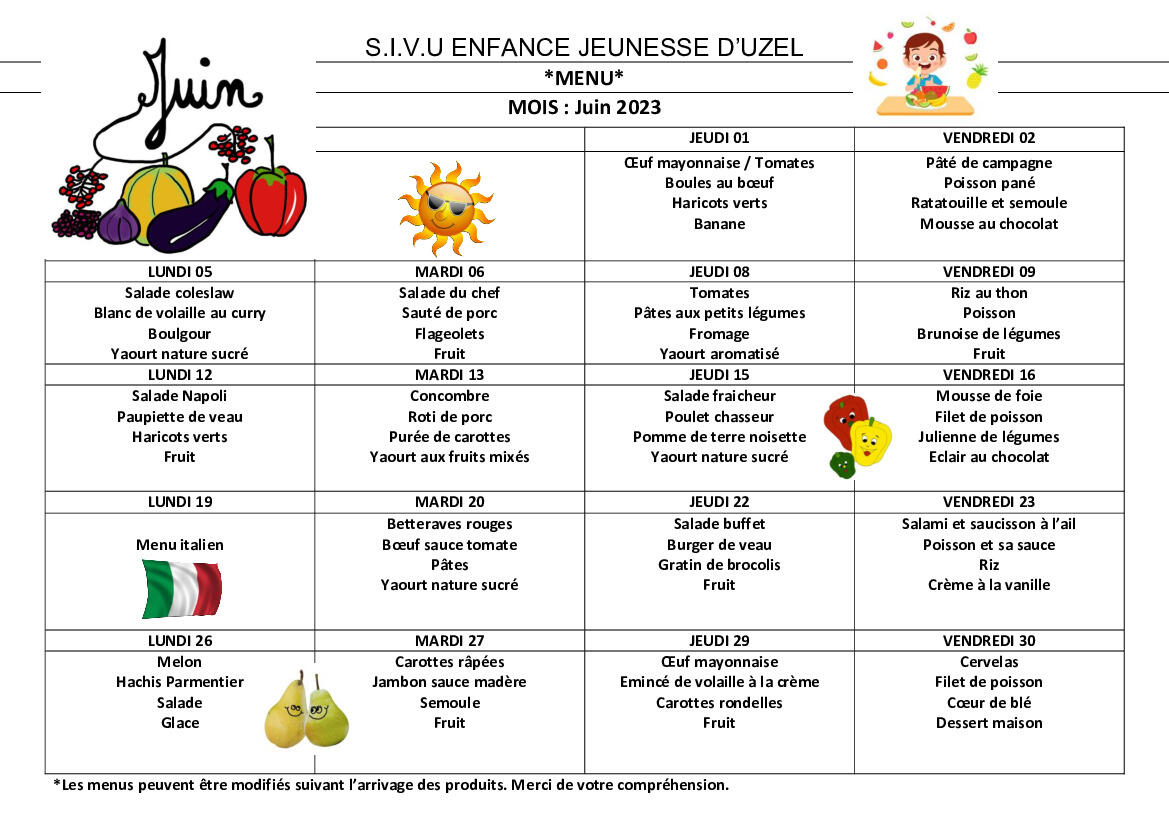 Menu de la cantine du mois de juin