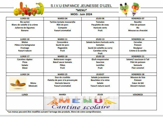 Menus de la cantine et programme CLO pour le mois de juin.