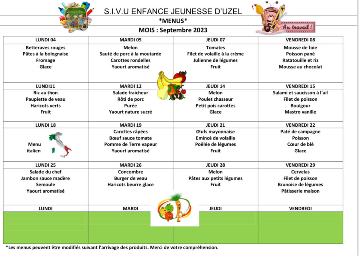 Menus de la cantine pour le mois de septembre