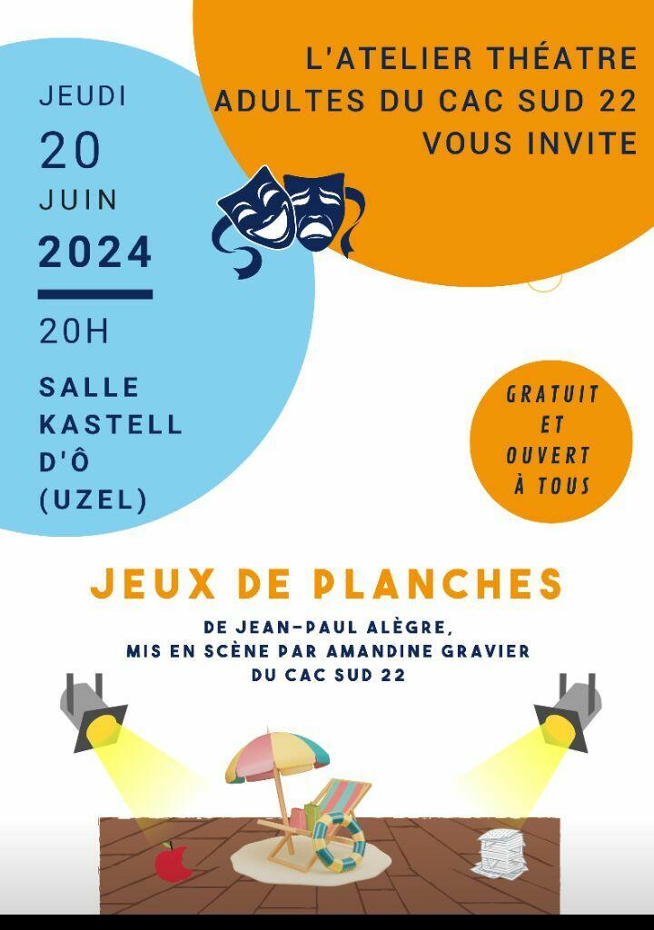 Les comédiens amateurs de l'atelier de théâtre pour adultes du Comité d'Action Culturelle Sud 22 vous invitent à découvrir leur représentation de fin d'année. Un spectacle drôle et malicieux, sur le monde du théâtre et ses jeux de planches. Gratuit et ouvert à tous."