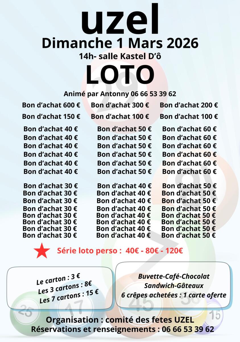 SUPER LOTO le dimanche 1er mars à Kastell d’ O