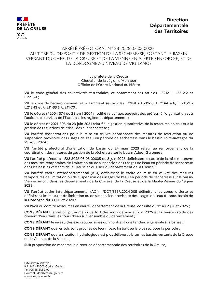 Veuillez trouver ci-joint l'arrêté préfectorale concernant les restrictions d'eau sur le département.