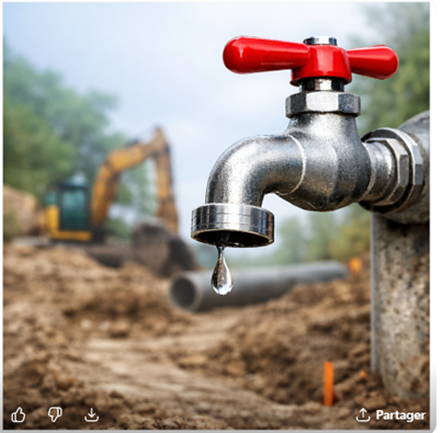 Dans le cadre des travaux réalisés chemin de la Graveline portant sur la création d’un réseau de collecte des eaux pluviales, l’entreprise a détérioré une conduite d’eau potable qui a engendré une coupure d’eau située :