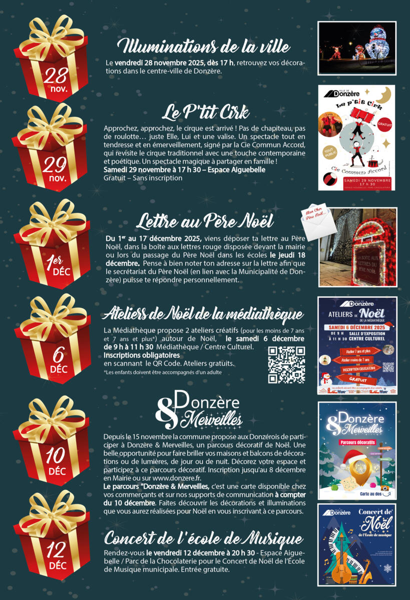 🎁 Samedi 6 décembre – 9 h à 11 h 30 : Ateliers de Noël de la Médiathèque (moins de 7 ans / 7 ans et +) – Centre Culturel – Sur inscription 📚 https://linktr.ee/villededonzere