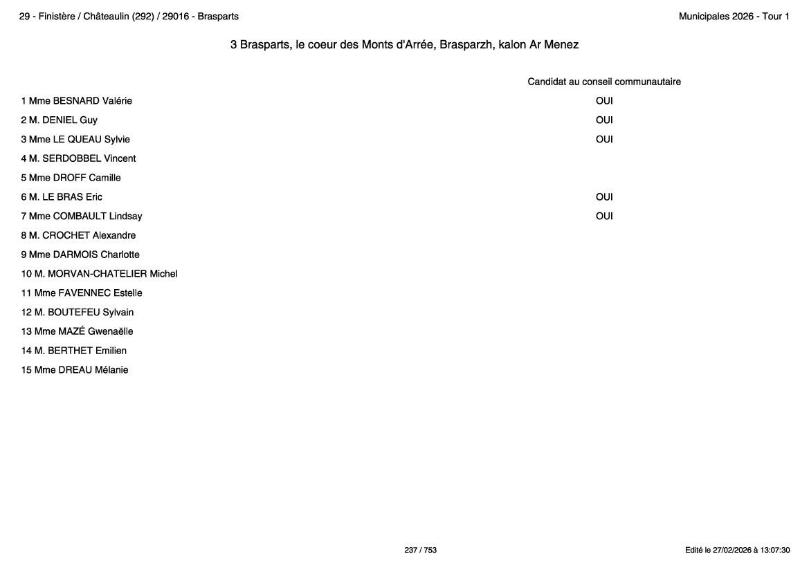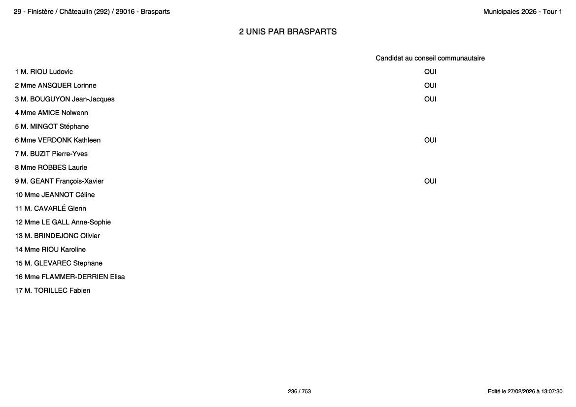 • Liste 2 - Unis par Brasparts, menée par Ludovic RIOU ;