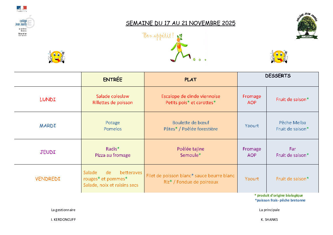 Menu cantine École / Collège du 17 au 21 novembre 2025
