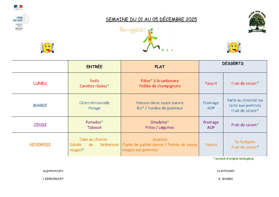 Menu cantine École / Collège du 01 au 05 décembre 2025