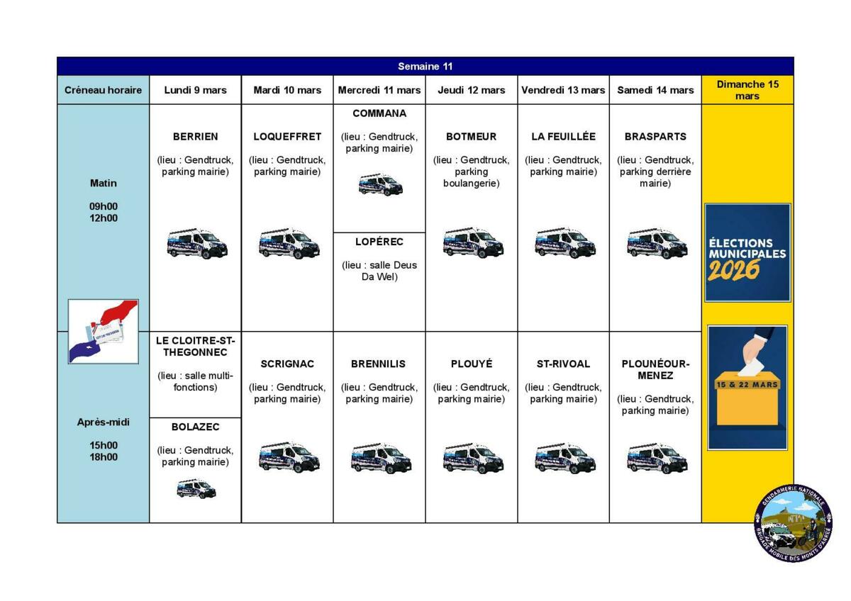 La gendarmerie de HUELGOAT sera de permanence sur la commune de PLOUYE 𝗹𝗲𝘀 𝗷𝗲𝘂𝗱𝗶𝘀 𝟱 𝗲𝘁 𝟭𝟮 𝗺𝗮𝗿𝘀 𝟮𝟬𝟮𝟲 𝗱𝗲 𝟭𝟱𝗵 𝗮̀ 𝟭𝟴𝗵 dans leur fourgon « Gendtruck ».