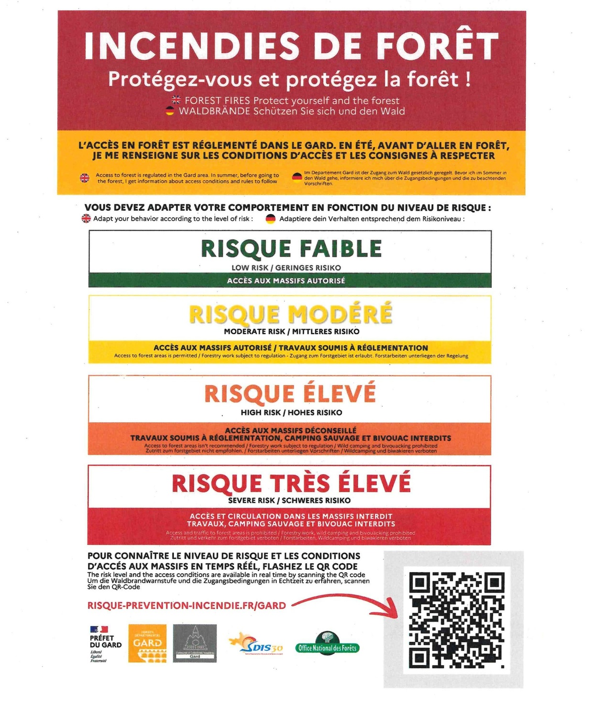 Entre le 15 juin et le 15 septembre, la carte du niveau de risque incendie de forêt pour le Gard est publiée quotidiennement à 18h pour le lendemain sur le site https://www.risque-prevention-incendie.fr/gard/