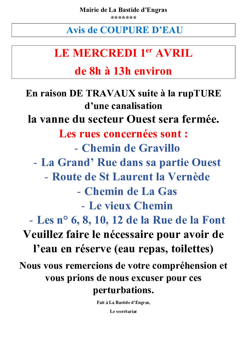 coupure EAU le MERCREDI 1er AVRIL de 8h à 13h environ