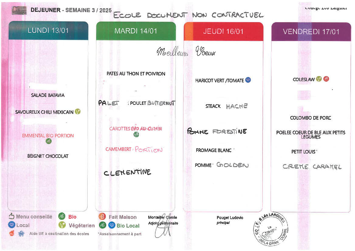 Menu de mi-janvier à la cantine