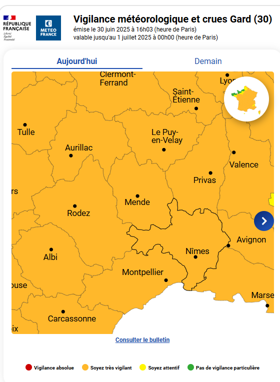 Vigilance orange pour canicule et orages dans les prochaines heures dans le Gard. Restez vigilants. Restez informés sur le site de Météo France : https://meteofrance.com/previsions-meteo-france/le-martinet/30960